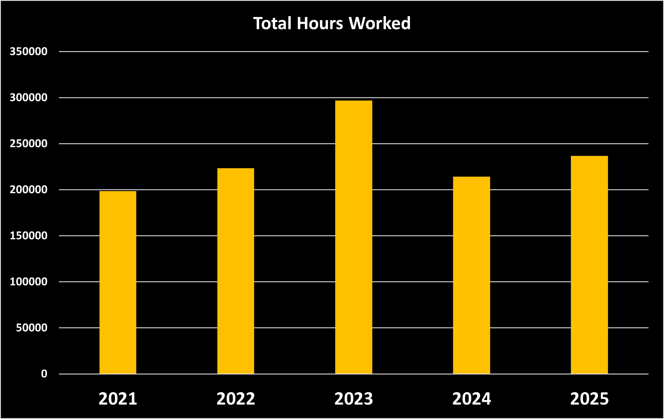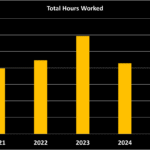 A bar chart graph showing the amount of hours worked throughout the years from 2021 to 2025